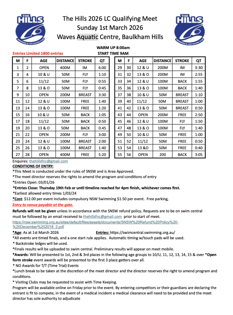** HILLS QUALIFYING MEET – 1 MARCH 2026 – NOW OPEN ON SWIM CENTRAL **