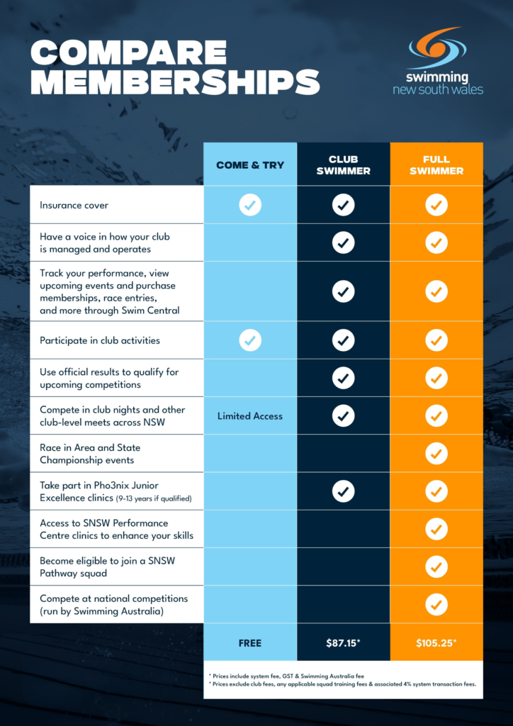 Below table summarises what is inluded in the main swimming membership categories set by Swimming NSW